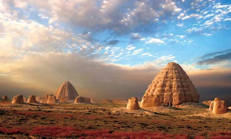 シルクロードの要衝に位置した西夏は、多民族・多文化が交錯する国家であり、その陵墓には仏教信仰や中原王朝の制度、遊牧文化などが融合した独自の世界観が表れています。これらの陵墓は、連なる賀蘭山の前に広がる広大なゴビ砂漠に築かれています。壮大な配置構成、幾重にも重なる墓壁、そびえ立つ塔状建築、そして多様な陵墓建築によって、西夏王朝特有の歴史的雰囲気と民族的特色が表現されています。